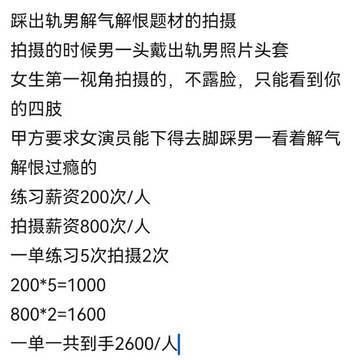纯大女主解气解恨题材的拍摄,薪资一次一结算,每个月都有10单左右,单量很多,有兴趣可以私我